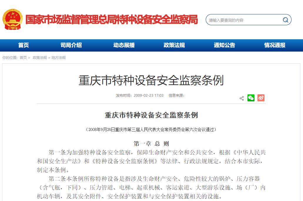 《重慶市特種設(shè)備安全監(jiān)察條例》2008年9月26日重慶市第三屆人民代表大會(huì)常務(wù)委員會(huì)第六次會(huì)議通過