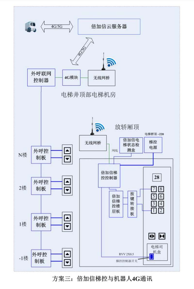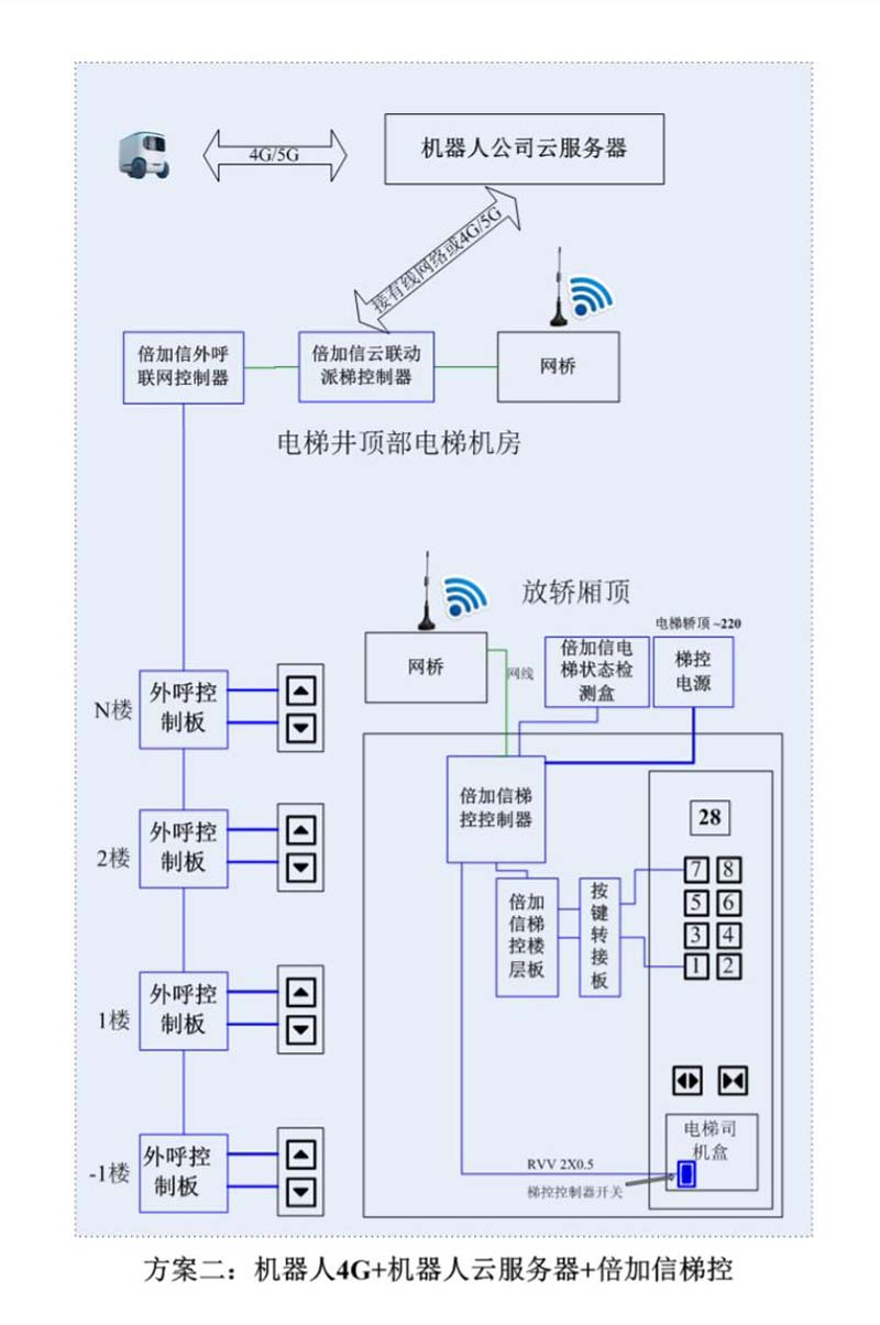 (1)機(jī)器人在電梯外,通個Wifi、藍(lán)牙、LoRa、Zigbee、2.4G、433M、語音或4G網(wǎng)絡(luò)等發(fā)送指令倍加信梯控系統(tǒng),系統(tǒng)自動點(diǎn)亮上樓或下樓按鍵,實(shí)現(xiàn)呼梯功能。