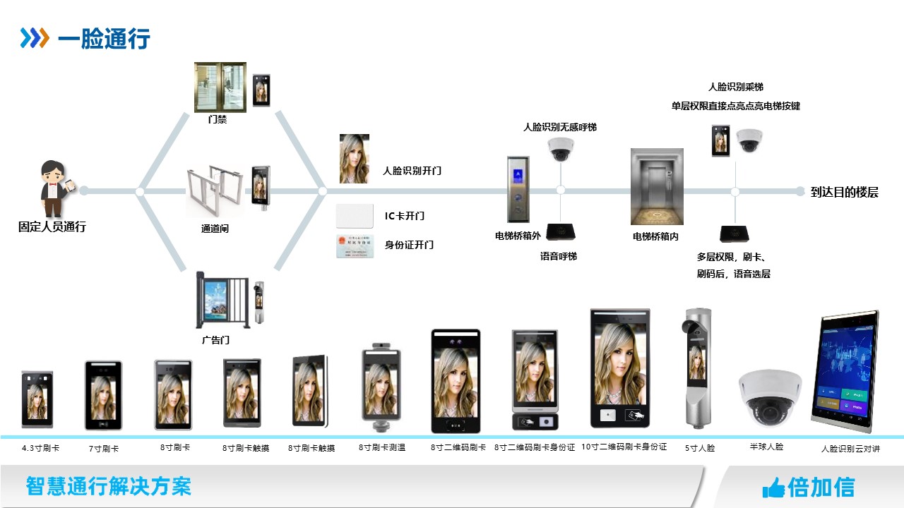 固定人員在門禁系統、梯控系統、通道閘系統、停車場系統、廣告門等系統,實現一碼通行、一卡通行、一臉通行。