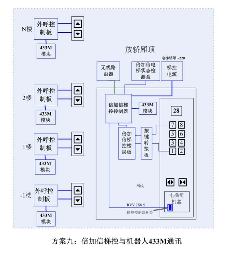 (4)倍加信機(jī)器人433MHz通訊乘梯系統(tǒng)可廣泛應(yīng)用于各種品牌電梯,且不影響電梯原有按鍵功能。