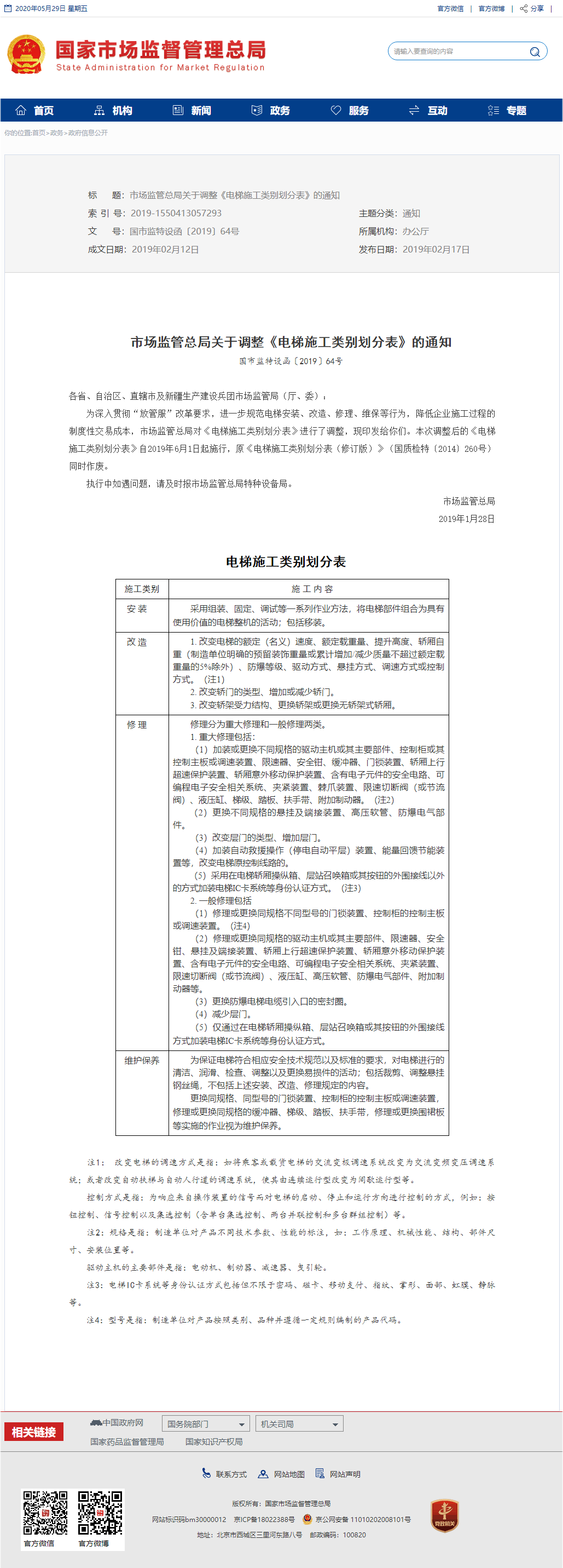 市場監管總局關于調整《電梯施工類別劃分表》的通知,說明了電梯加裝梯控所屬類型,說明是容許電梯加裝梯控系統的,電梯加裝梯控是不違法的。
