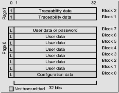 頁0有8個塊,每個塊有33位,第一位為鎖定位,當(dāng)?shù)谝晃粚懭霝?,該塊后面的32位就無法修改了。頁0塊0為配置字,決定了卡片跟閱讀器通信時工作的頻率,調(diào)制方式及卡片頁0塊號可見數(shù)目等。配置字很關(guān)鍵,同樣的T5557卡片,有些閱讀器能讀,有些閱讀器不能讀的,這個閱讀器內(nèi)部單片機(jī)的具體程序設(shè)計(jì)相關(guān),所以一旦設(shè)置好不要輕易修改。
